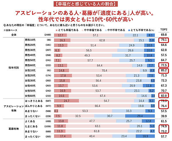 最後に、現在の幸福度について聞いたところ、全体では69.8%が「幸福」と感じていることがわかった。年代別では、特に10代と60代でその割合が高かった。