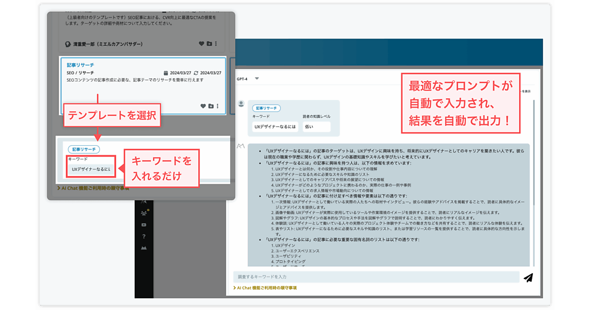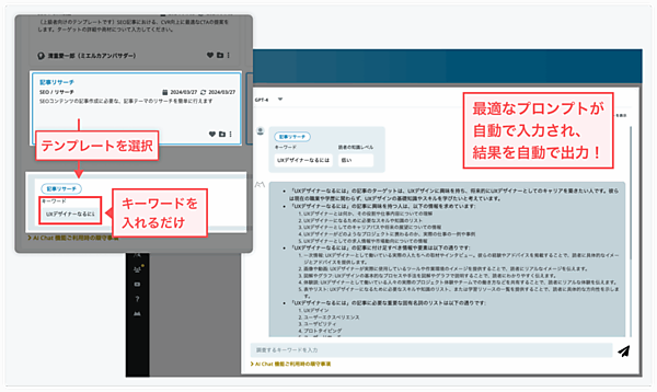 AIチャット機能は①データがAIの学習に使われない環境②テンプレート機能での効率化③専門知識に基づくマーケティングプロンプト(指示文)の提供--を特徴とする。①は名前やメールアドレスなど個人情報とみなされるデータを入力すると自動検知して別の文字に置き換える仕組み。②は入力内容をテンプレートとして保存して繰り返し利用できる機能。