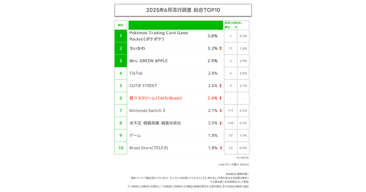 最新6月期の総合トップ10を見ると、スマホゲーム「Pokemon Trading Card Game Pocket(ポケポケ)」3.8%が1位。前回調査(2025年3月)の9.3%からはかなり数字を落としたが、3期連続のトップとなった。「シャイニングハイ」など定期的に新パック投入が行われており、どこまで維持できるかが注目だ。