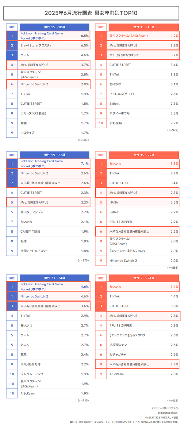 男女別・年齢別で見ると、男性は全年齢層で「ポケポケ」が1位。一方女性は15~18歳で「愛❤スクリ~ム!」が1位、19~22歳・23~24歳で「ちいかわ」が1位と違いが見られた。なお総合3位の「Mrs. GREEN APPLE」は男性23~24歳を除く、すべての層でランクインしている。