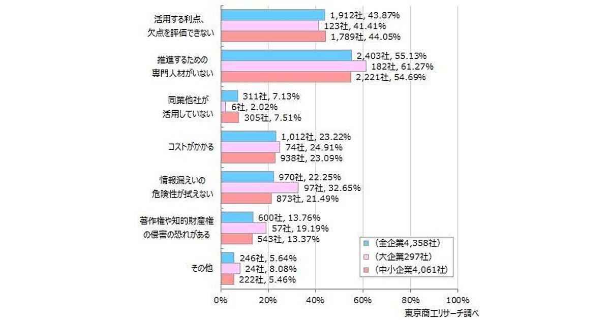 一方で、生成AIの活用を推進していない理由を聞くと、「推進するための専門人材がいない」が55.1%で最も多く、ついで「活用する利点、欠点を評価できない」が43.8%となった。また、コスト面やセキュリティ面などを懸念する声も多かった。
