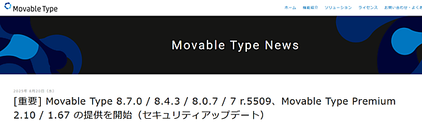 アップデートの対象は、Movable Typeの「7 r.5509」ソフト版、クラウド版、AMI版▽「8.0.7」ソフト版、AMI版▽「8.4.3」ソフト版、AMI版▽「8.7.0」クラウド版と「Movable Type Premium」の「1.67」ソフト版、クラウド版▽「2.10」のソフト版、クラウド版--。