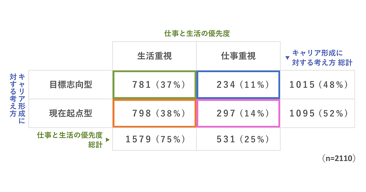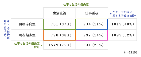 「働く上での価値観」については、仕事と生活の優先度は「生活重視」75%、「仕事重視」25%で圧倒的に生活重視が多い。キャリア形成に対する考え方は、目標を定めずに今できることに懸命に取り組もうとする「現在起点型」と、目標を定めてその実現を目指していこうとする「目標志向型」がほぼ半々となっている。