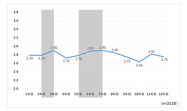 「現在の会社を働く場所の1つとしたときに、今後働く場所や転職について今のあなたの感覚に一番近いもの」と選択式で聞き、入社1年目~12年目までで集計すると、離職意向が高まる時期は「3年目」と「5~7年目」だった。