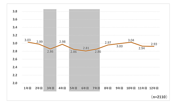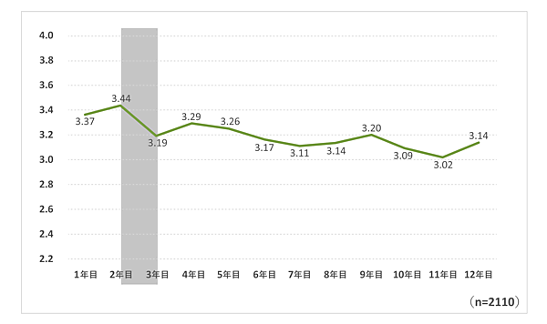 一方「上司の関わり」(背中を押してくれる、挑戦の場を提供してるなど)は、1、2年目は高い水準にあるが、3年目に0.25ポイント下がる。3年目は、上司や周囲から本格的に独り立ちを求められる時期であり、上司が意図して関わりを弱めている可能性がある。