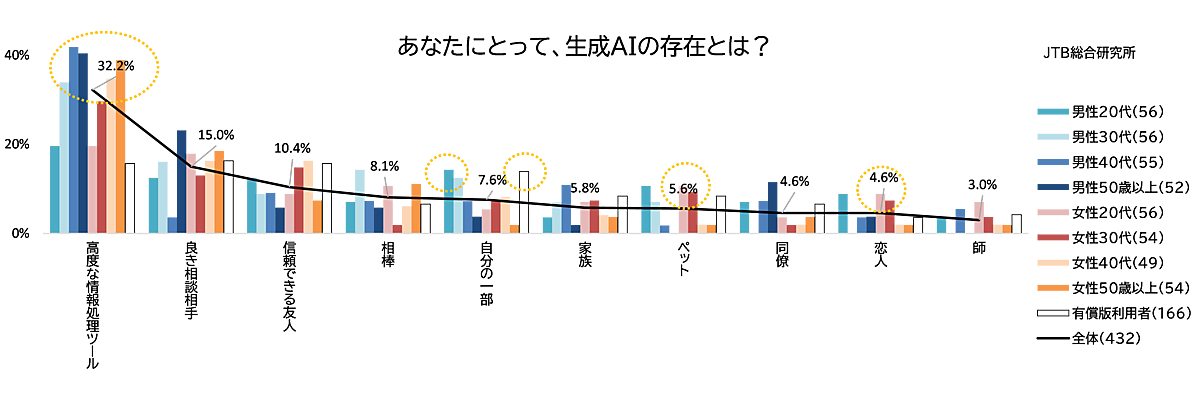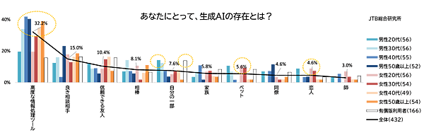 最後に、生成AIをどのような存在として捉えているかを聞くと、「高度な情報検索ツール(32.2%)」が最も多く、以下「良き相談相手(15.0%)」、「信頼できる友人(10.4%)」と続いた。年齢が上がるほど「高度な情報検索ツール」の割合が高くなる一方で、若年層男性では「自分の一部」、若年層女性では「ペット」「恋人」といった回答も目立った。