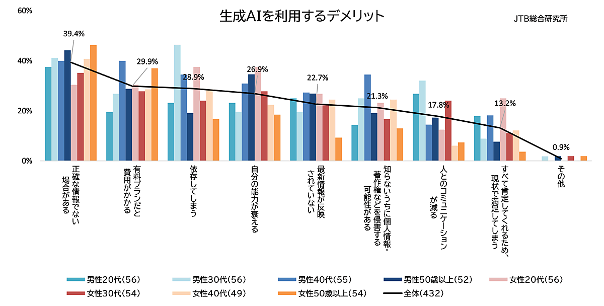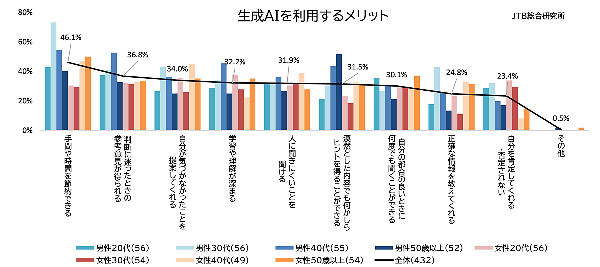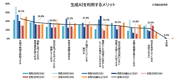 JTB総合研究所は、「生成AIの利用と旅行についての調査」を実施した。日常や旅行における生成AIの活用方法について、スクリーニング調査では10,705人、本調査では432人を対象に調査している。