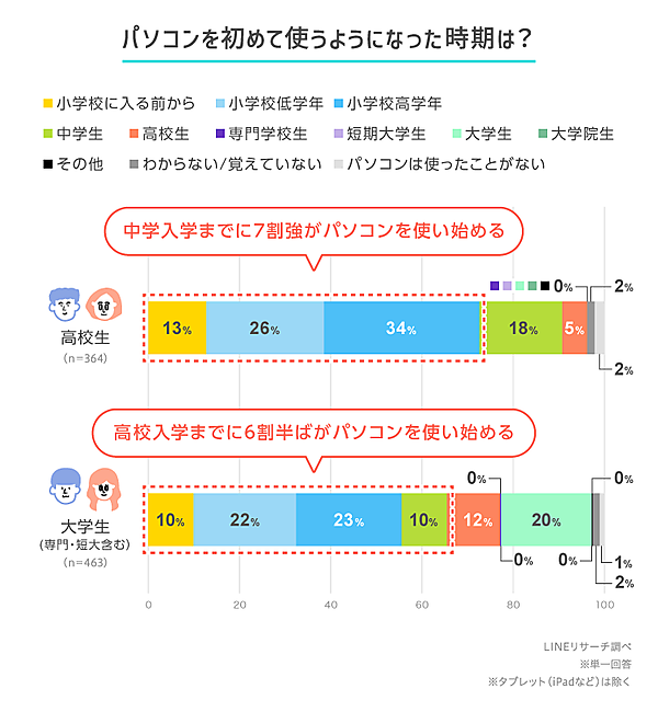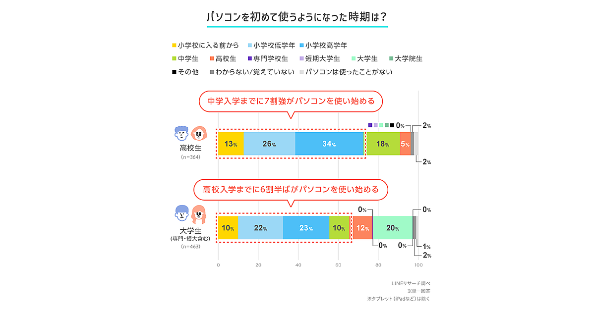 まず「自宅、学校、塾などでパソコンを初めて使った時期」(タブレットなどは除く)を聞くと、高校生は「小学校に入る前から」13%、「小学校低学年」26%、「小学校高学年」34%だった一方、大学生では「小学校に入る前から」10%、「小学校低学年」22%、「小学校高学年」23%となっており、ここ数年でPC遭遇の低年齢化が進んでいる様子がうかがえる。