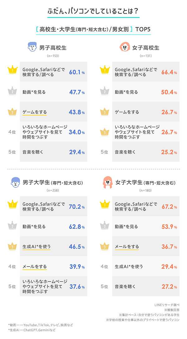 続いて自分のPCを持っている722人に、「ふだんパソコンでしていること」を聞くと、「Google、Safariなどで検索する/調べる」が総合1位、「動画を見る」が総合2位だった。3位は高校生は「ゲームをする」だが、男子大学生は「生成AIを使う」、女子大学生は「メールをする」だった。