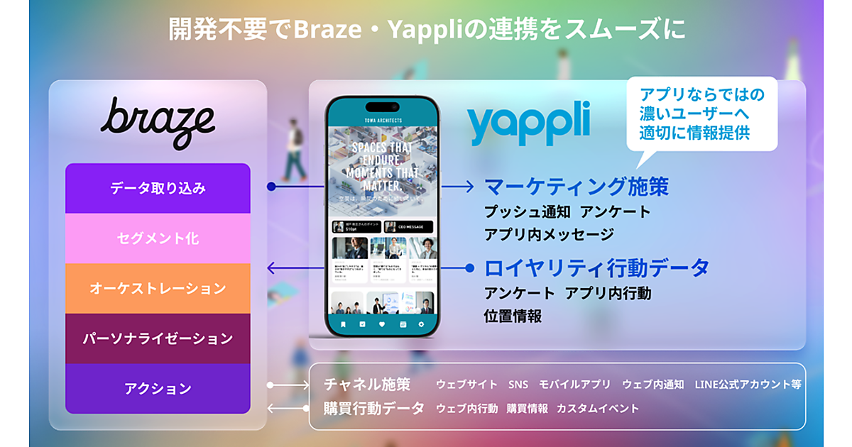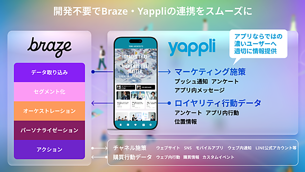 ノーコード(プログラミング不要)のアプリ開発プラットフォーム「Yappli(ヤプリ)」を展開するヤプリは、カスタマーエンゲージメント(顧客関係)プラットフォーム「Braze(ブレイズ)」を展開するBrazeとの連携を8月25日に発表した。Yappliで開発されたアプリで、ユーザーの行動データをリアルタイムにBrazeに連携でき、パーソナライズされたプッシュ通知やアプリ内メッセージで高度な1to1マーケティングが実現可能になる。