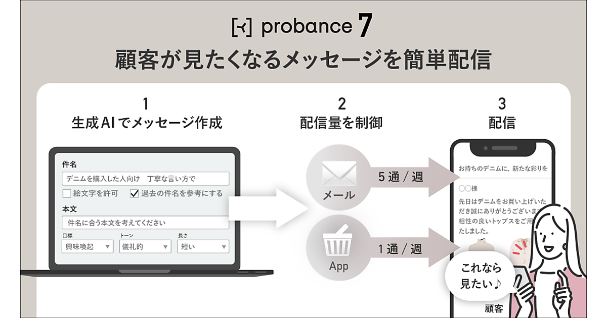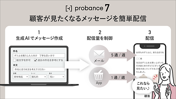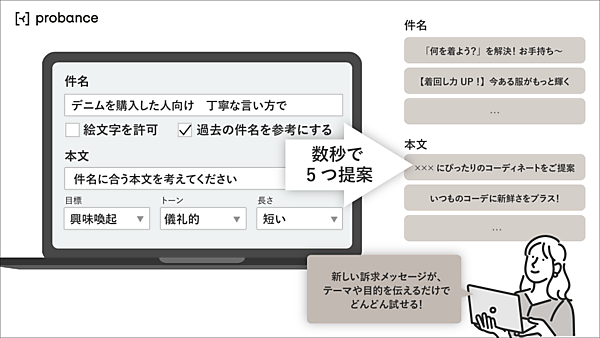 AI(人工知能)アシスタント機能の搭載によって、担当者はターゲットや訴求内容を指示するだけで、顧客に訴求するタイトルや本文を生成AIが自動生成する。タイトルの作成では過去の件名を参照して表記スタイルの一貫性を保ち、文面の作成では「目標、トーン、長さ」など主要な指示をプルダウンで選択すれば瞬時に文案を提示する。