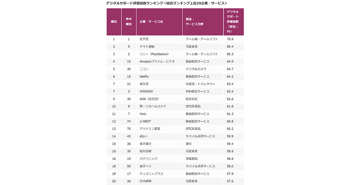 2位は昨年5位から順位を上げた「ヤマト運輸」、3位は1つ順位を落とした「ソニー(PlayStation)」、4位は昨年10位から大躍進した「Amazonプライム・ビデオ」がランクインした。