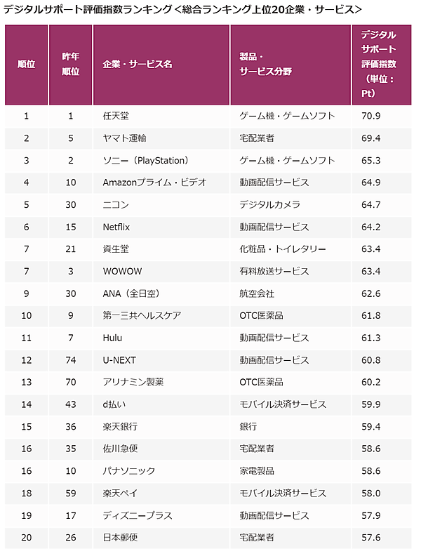 デジタルサポートランキング、「任天堂」が2年連続のトップ死守