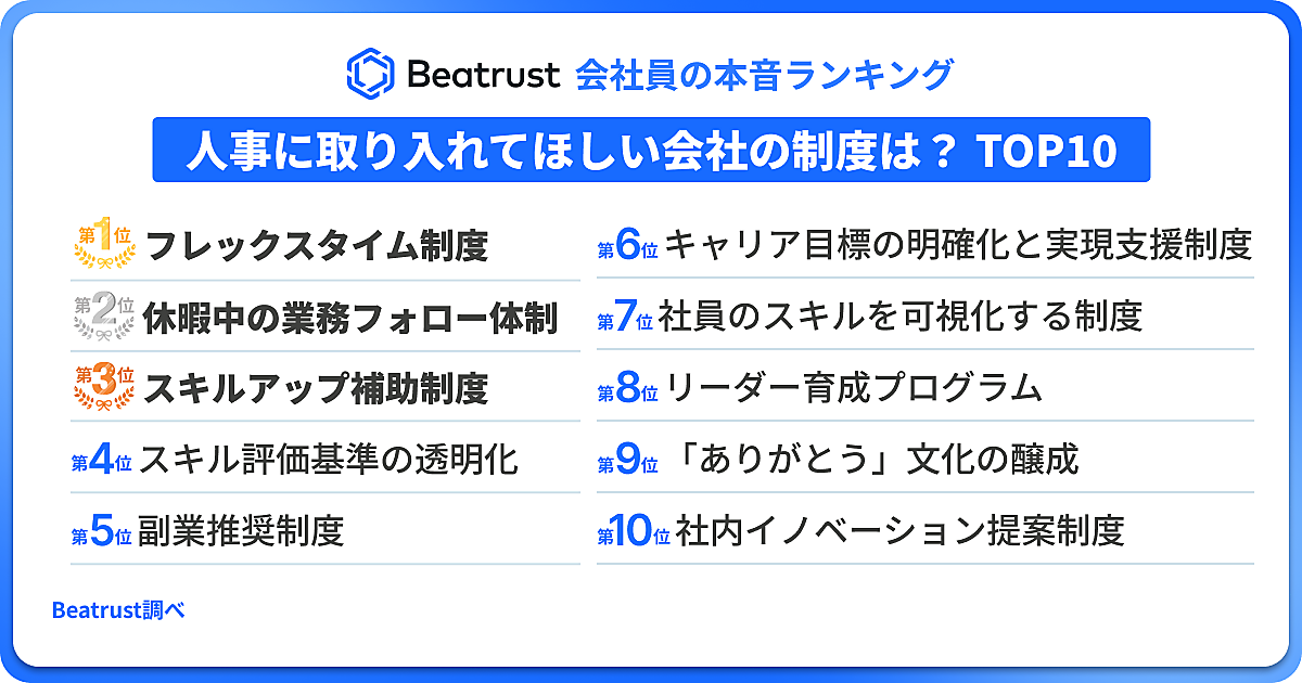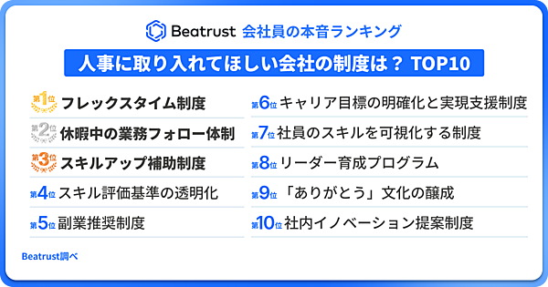 タレントコラボレーション・プラットフォーム「Beatrust」を提供するビートラストは、「人事に取り入れてほしい制度」に関する調査結果を発表した。全国の22~59歳の会社員1,000人が回答している。