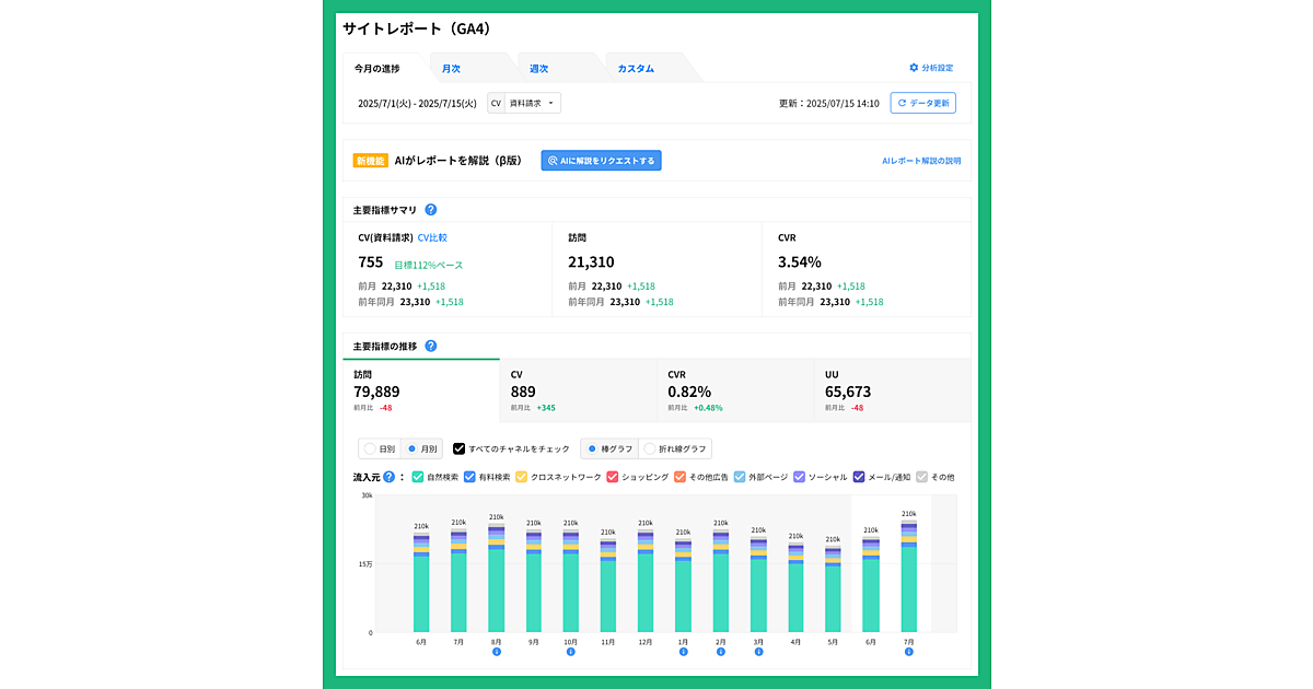 サイトレポートはWebサイトの主要指標を月次・週次で定点観測する分析機能。ページビューなどの指標を集約して、Webサイトの状態や変化を把握するダッシュボードの役割を果たす。新たな解説機能はAIアナリストとして初めて機械学習を備えた生成AIを利用。サイトレポートの数値データから生成AIが現状分析と改善提案を提示する。単月だけでなく前月データとの比較した考察を加えて、変化の背景や意図を理解しやすい。