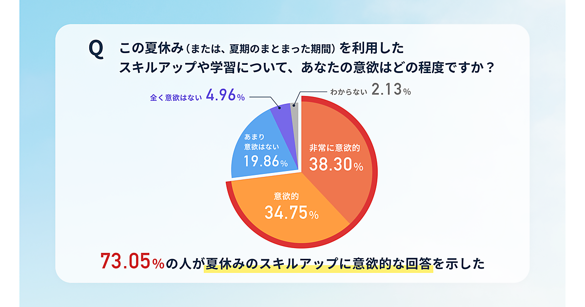 まず「今年の夏休みは、どのように過ごす予定ですか?」と聞くと、「スキルアップのための学習」32.29%が最多。スキルアップに対する意欲についても「非常に意欲的」38.3%、「意欲的」34.75%と過半数が高かった。
