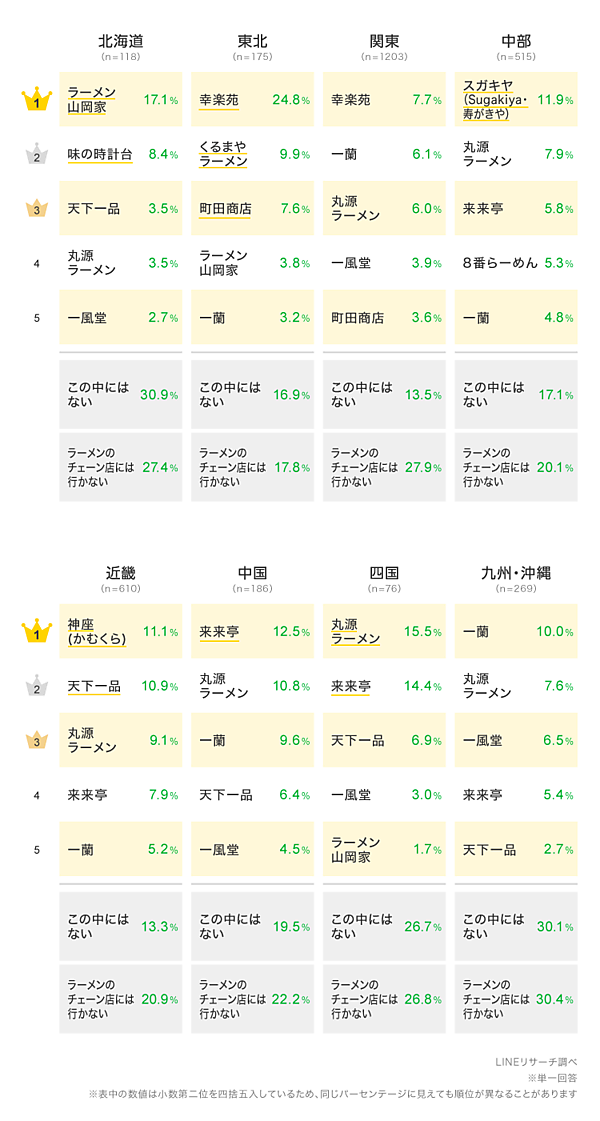 LINEヤフーが運営する「LINEリサーチ」は、「一番好きなラーメンのチェーン店」に関する調査を実施した。15歳~69歳の男女3,152名が回答している。