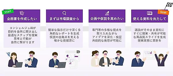 調査リポートは1万字超を出力でき、デザイン資料は10枚以上のスライドの作成が可能になった。新機能によって、新しいアイデア創出から市場投入までの期間を約1.5~2倍に短縮でき、アイデア創出量も約2~3倍に増えると試算している。リサーチ・企画・資料作成の自動化で担当者の業務工数を平均40%削減し、外部委託業務を代替して年間約30%のコスト削減が見込まれる。料金体系は月額90万円(10アカウント)から。