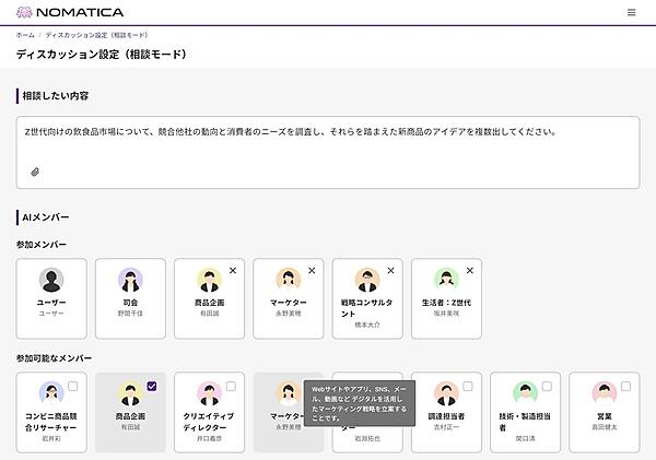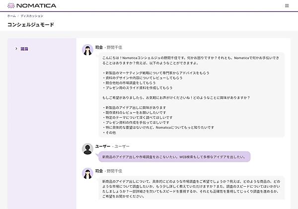 Nomaticaはさまざまな専門知識や人格を与えた30超のAIエージェント(専門家・生活者)が協調して企画を提案する。新機能にはユーザーの意図を会話形式で理解して最適なプロンプト(指示文)や専門家エージェントを自動選定する「コンシェルジュAI機能」、WEB上の膨大な情報収集と分析で出典付き調査レポートを自動生成する「Deep Research機能」、デザイン性の高い資料を数分で自動生成する「デザイン資料作成機能」――の3つがある。