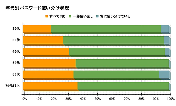 パスワード使い分け状況を年代別で見ると、「すべて同じ」は年代が上がるごとに割合が増え、40代以上では3割を超える結果となった。また、すべての年代で「一部使い回し」が多数派となり、「常に使い分けている」は1割未満にとどまった。