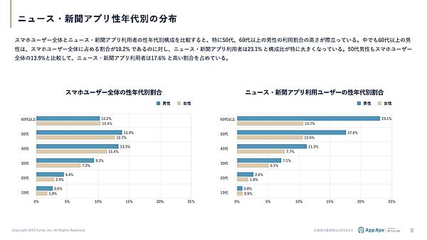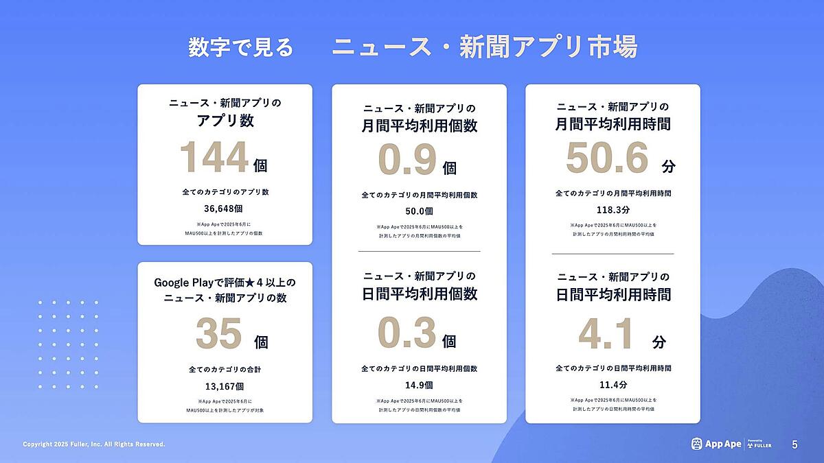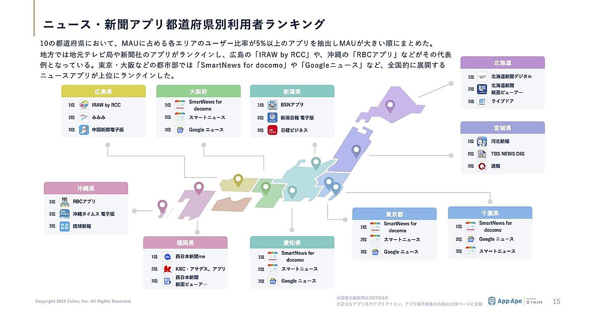フラーは、「ニュース・新聞アプリ市場調査レポート2025」を公開した。アプリ市場分析サービス「App Ape(アップ・エイプ)」で蓄積したデータをもとに、ニュース・新聞アプリの動向を年代別・地域別にまとめている。