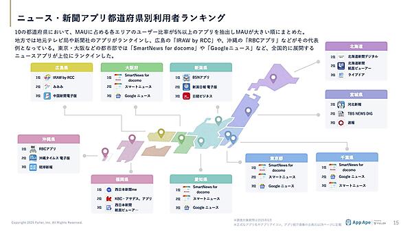 都道府県別のニュース・新聞アプリ利用者ランキングを見ると、地方では広島県の「IRAW by RCC」、沖縄県の「RBCアプリ」、宮城県の「河北新報」、北海道の「北海道新聞デジタル」など、地元テレビ局や新聞社のアプリが多くランクインした。一方で、東京・大阪などの都市部では「SmartNews for docomo」や「Googleニュース」など、全国的に展開するニュースアプリが上位となった。