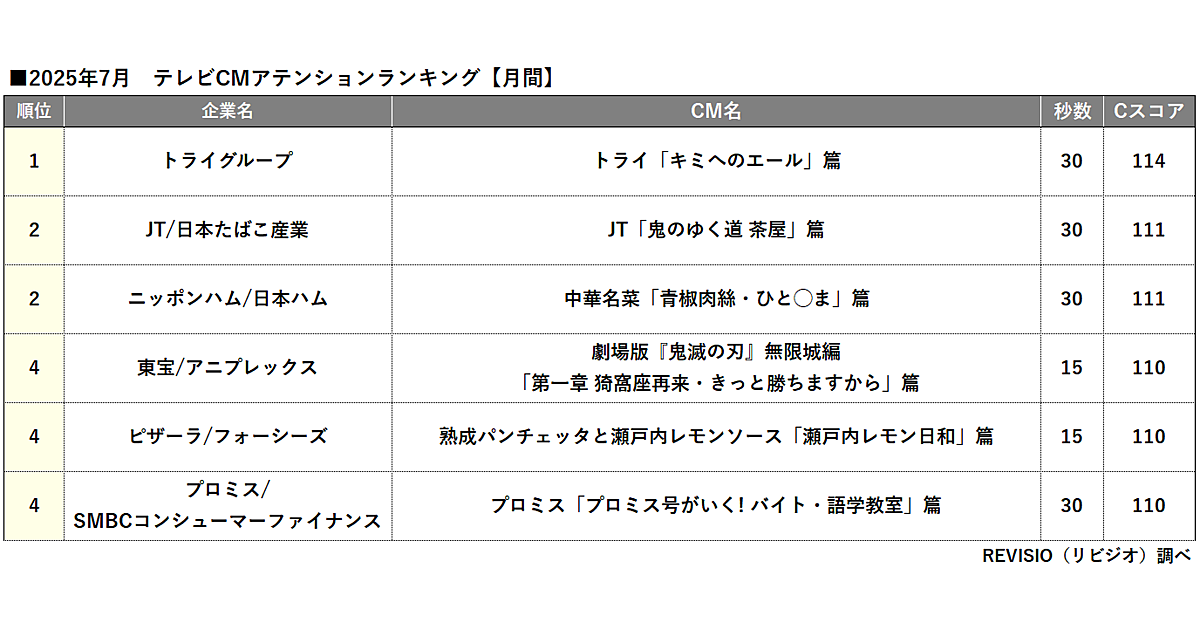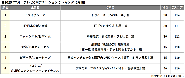 REVISIOは、2025年7月に放送されたテレビCMの「アテンション」ランキングを発表した。