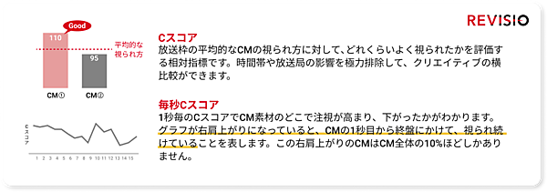 同社では、各家庭に人体認識技術を搭載した機器を設置し、テレビスクリーンに対する「アテンション(=注視)」を測定。今回のランキングでは、地上波の関東キー局で放送されたテレビCMを対象に、CMがどれだけ視聴者に注目されたかを示す評価指標「Cスコア(クリエイティブスコア)」を算出した。