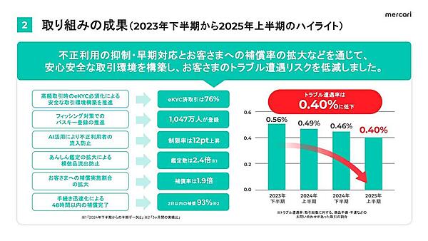 AI(人工知能)による不正検知範囲の拡大で利用制限率が12ポイント増加。出品時に「あんしん鑑定」を利用可能に設定した商品数が半年間で約2.4倍に増えた。93%の商品が到着後48時間以内に補償され、マーケットプレイス全体の信頼性向上のため、衛生マスクや米穀全般など一部商品の取引制限を実施した。レポートは今後も定期的に公開する。