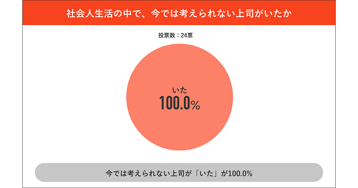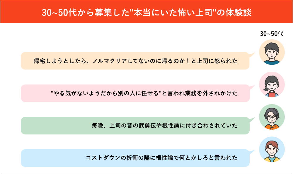 この調査は20~50代男女が対象だが、30代~50代に限ると「社会人生活のなかで“本当に怖い上司”がいたか」を聞くと「いた」は100.0%で、全員が怖い上司に遭遇していた。