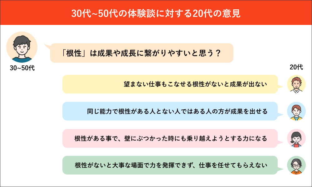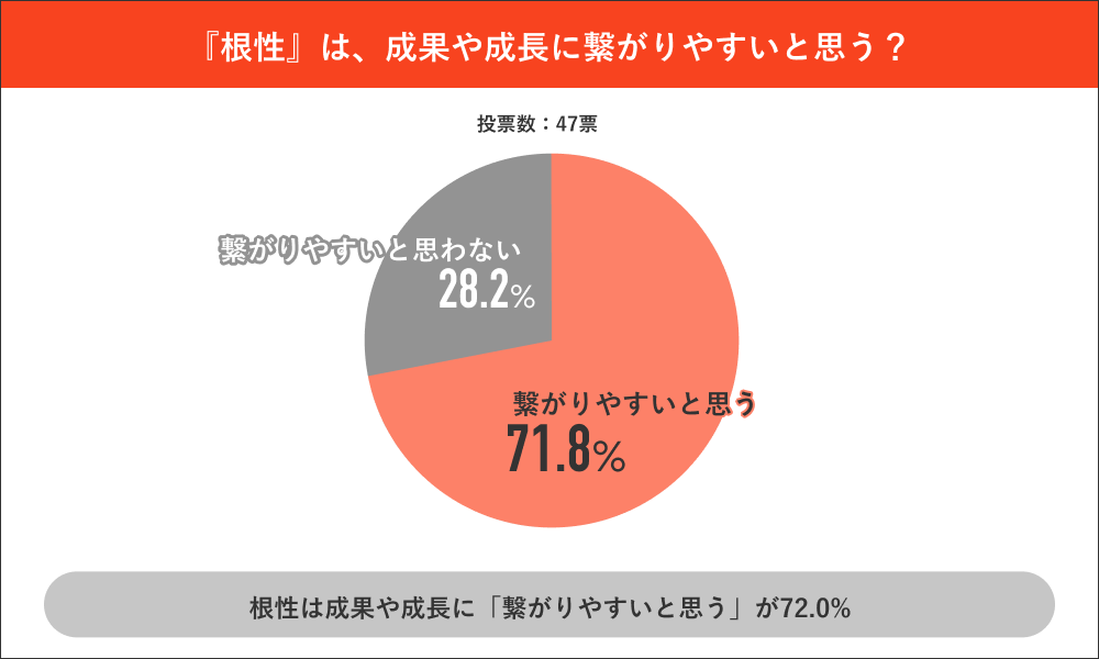 そこで「根性は、成果や成長に繋がりやすいと思うか」と20代に聞くと、「繋がりやすいと思う派」71.8%、「繋がりやすいと思わない派」28.2%と、比較的肯定的な意見が多く集まった。「根性が突破口となり成功を引き寄せる」「上司から信頼を得るためには下積みも必要」「根性がある人の方が成果を出せる」など、上司に評価されることも含め、根性が成長に繋がると考える若手が多いようだ。