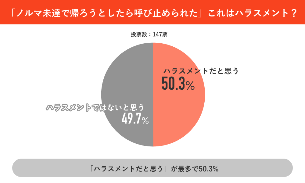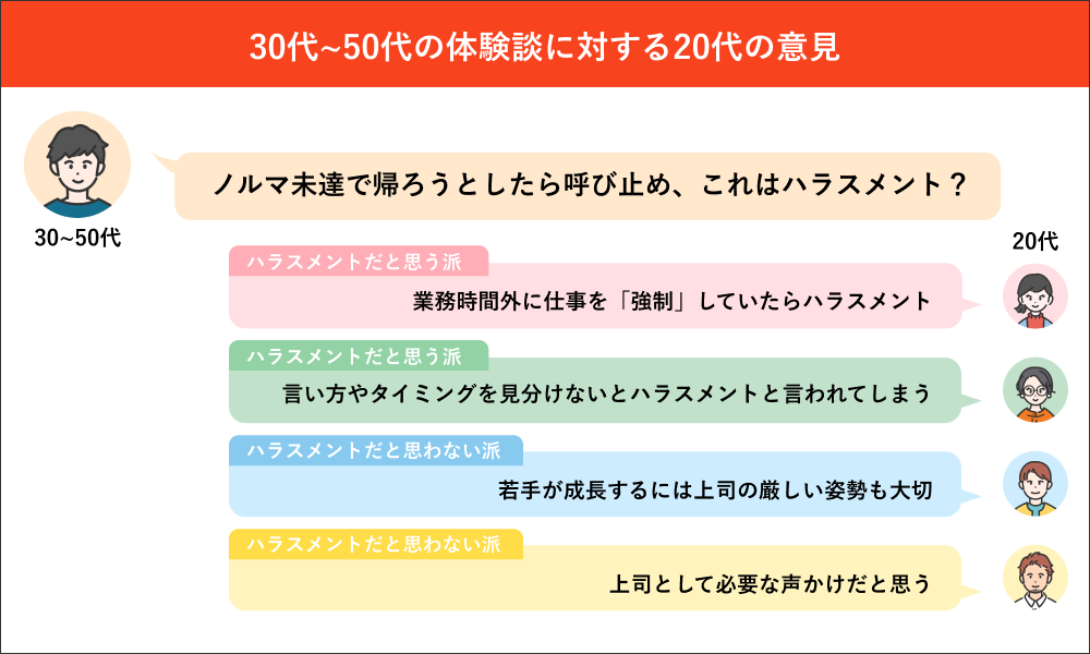 また「ハラスメントに関する認識」を探るため、「ノルマをクリアしてないのに帰るのか!と怒られた」エピソードについて20代に聞くと、「ハラスメントだと思う派」50.3%、「ハラスメントだと思わない派」49.7%と意見が真っ二つに割れた。「定時に帰らせない、つまり業務時間外に仕事を“強制”していたらハラスメント」という考えと、「伝え方次第。上司の厳しい姿勢も大切」という考えで、回答者の立場が二極化しているようだ。