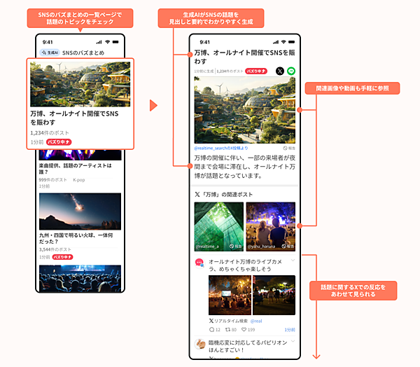 LINEヤフーは、X(旧Twitter)の投稿をリアルタイムで検索できるサービス「Yahoo!リアルタイム検索」で、X上で話題のワードに関連する投稿を生成AI(人工知能)が自動で要約する「SNSのバズまとめ」を9月2日から提供を始めると発表した。リアルタイム検索で提供するトレンドランキングで一定以上の投稿数が集まった話題を分析し、「何が起きたのか」「なぜ話題になったのか」「どう反応しているのか」などを自動で要約する。