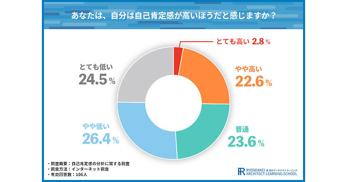 新生技術開発研究所の通信教育講座「諒設計アーキテクトラーニング」は、「自己肯定感の分析」に関する調査結果を発表した。全国20~60代の男女106人が回答している。