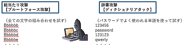 すべての文字列の組み合わせを試す「総当たり攻撃」や、パスワードでよく使われる言葉などを集めた専用の辞書を利用する「辞書攻撃」。意味のある単語や、自分に関連の深い語句を使うと、辞書攻撃などによってパスワードを破られる可能性がある。