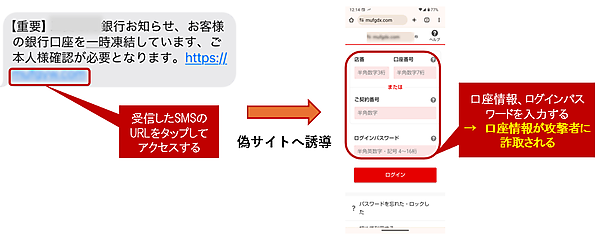 自分のスマートフォンにSMSで認証コードが届き、攻撃者にそれを伝えてしまう。 - 認証コードを利用してアカウントを乗っ取られる