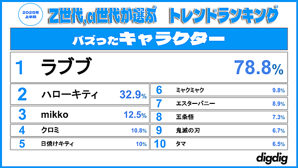 キャラクター部門では、今世界中で大人気のぬいぐるみ「ラブブ(LABUBU)(78.8%)」がトップ。香港出身のイラストレーターが手がけたキャラクターで、中国のPOP MART(ポップマート)でフィギュア化、販売されている。ラグジュアリーブランドのバッグにつけるのがトレンドで、一部では入手困難になるほどの人気ぶりだ。