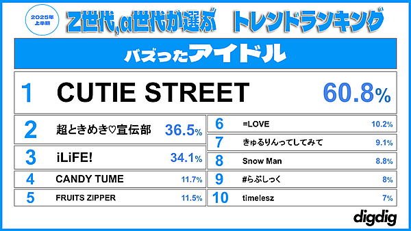 アイドル部門では、「キュースト」の愛称で知られる「CUTIE STREET(60.8%)」が1位に。デビュー曲「かわいいだけじゃだめですか?」がTikTokでバズり、注目を集めた。