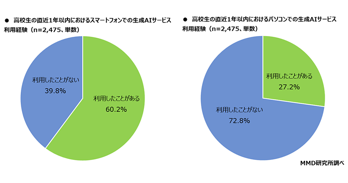まず「直近1年以内におけるスマートフォンでの生成AIサービス利用経験」を聞くと、「利用したことがある」は60.2%。「パソコンでの利用経験」は27.2%だったため、高校生の多くはスマホからAIを利用していることが判明した。