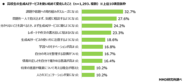 さらに、生成AIサービスを利用したことがある高校生1,540人に、「生成AIサービス利用開始後における変化の有無」を聞くと、84.0%が「変化したことがある」と回答。具体的には「課題や宿題への取り組みがスムーズになった」32.7%、「問題を一人で抱え込まず、気軽に相談するようになった」27.6%、「分からないことを調べるとき、まず生成AIサービスに聞くようになった」24.2%が上位となった。
