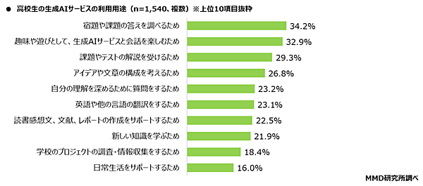 また「生成AIの利用用途」では「宿題や課題の答えを調べるため」34.2%、「趣味や遊びとして、生成AIサービスと会話を楽しむため」32.9%、「課題やテストの解説を受けるため」29.3%が上位だった。