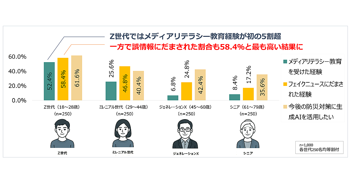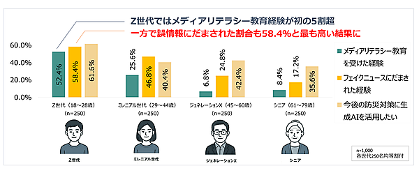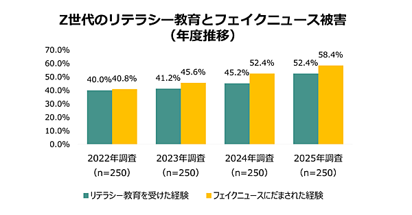 情報接触の頻度、SNSの活用率などの差もあるが、リテラシー教育を受けている人間でも容易にだまされるという現状が浮き彫りになったといえる。なお、だまされたという人は増加傾向にあり、Z世代では過去最高だった。