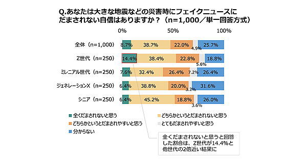 一方で「フェイクニュースにだまされない自信」について聞くと、全年代で「まったくだまされないと思う」8.7%、「どちらかというとだまされないと思う」38.7%と、合計47.4%が高い自己評価をしていた。特にZ世代では「まったくだまされないと思う」が14.4%ともっとも高く、自信過剰の傾向が見られた。