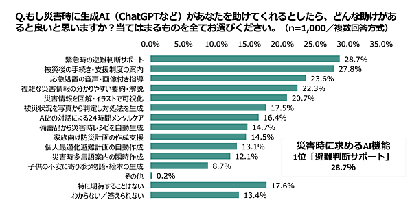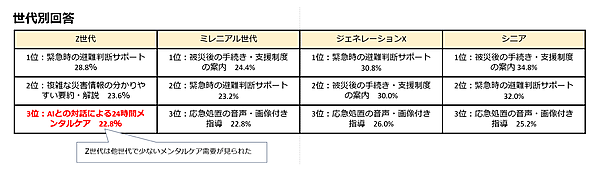 「災害時に生成AIが助けてくれるとしたらどんな助けがあると良いと思うか」では、「緊急時の判断サポート」28.7%が最多。以下「被災後の手続き・支援制度の案内」27.8%、「応急処置の音声・画像付き指導」23.6%が続く。高齢世代では「避難所管理」「経路案内」など実用的機能への期待が高い一方、Z世代では「AIとの対話による24時間メンタルケア」22.8%などが高かった。