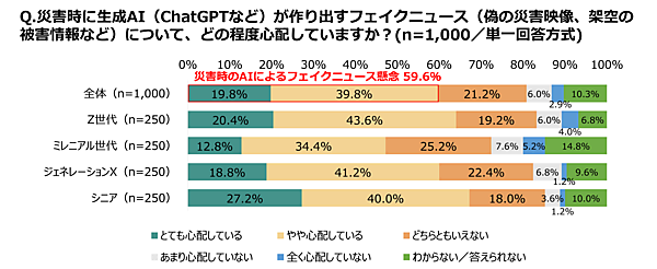 一方で「災害時、生成AIによるフェイクニュース拡散への懸念」は59.6%に達している。SNSで話題になればそれで良いとする炎上系ユーザーによる偽情報拡散には、今後さらに注意が必要だろう。