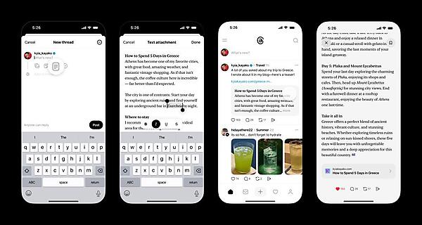 今回のアップデートは特にクリエイターにとっての利用体験を改善する取り組みの一環。小説やニュースレターなど長文コンテンツを発表しているクリエイターは、自身の活動をThreads上でより簡単にプロモートできる。添付テキストには外部Webサイトのリンクを含められるので、書籍の一節をプレビューとしてThreadsの投稿に添付し、全文を読むリンクや書籍を購入するリンクなどを一緒に掲載できる。