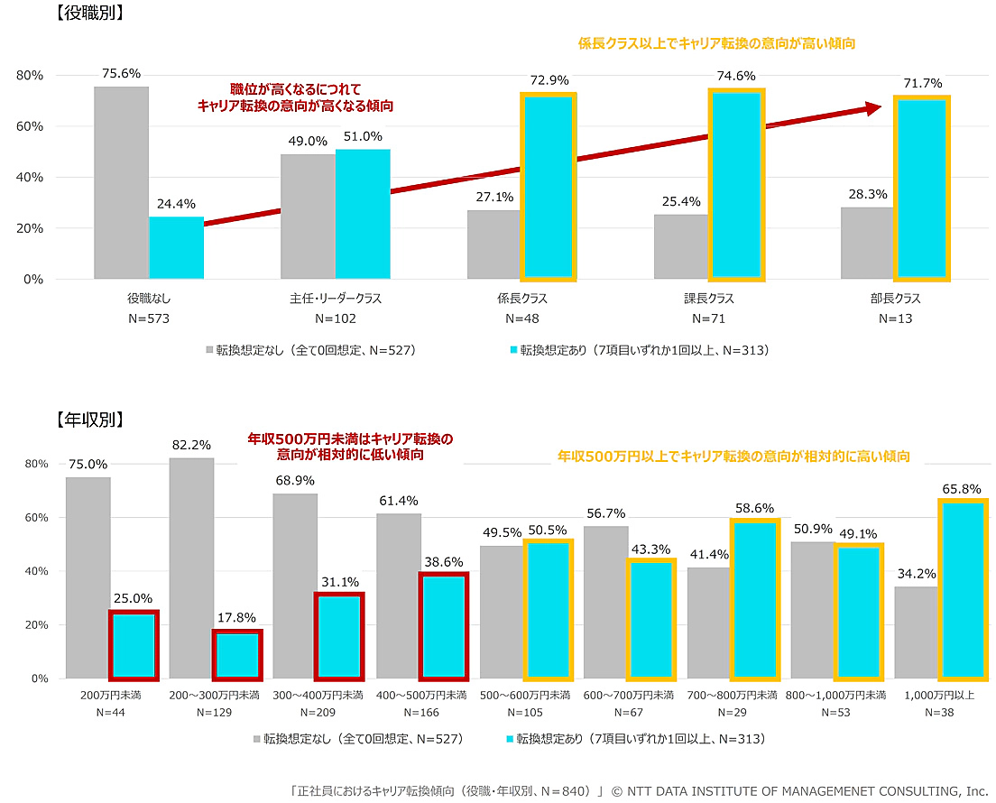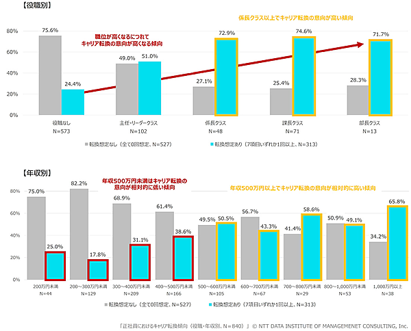 キャリア転換について役職別で見ると、係長クラス以上は70%以上が転換を想定していたが、主任・リーダークラスは51.0%、役職なしは24.4%にとどまった。年収別では、500万円以上の層は約50%が転換を想定していたが、500万円未満の層は17.8~38.6%にとどまった。