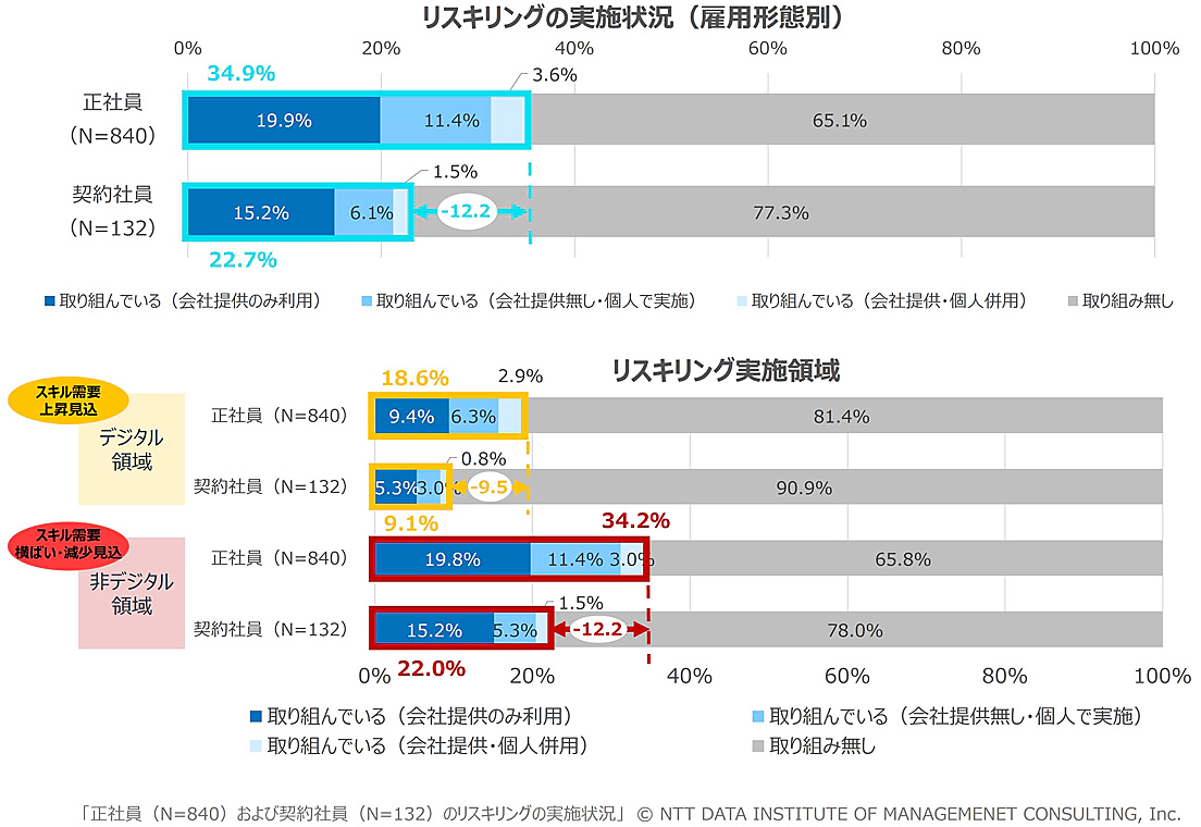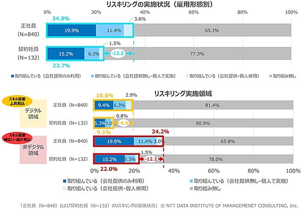 さらにリスキリング実施率について、12スキル領域別に集計すると、「取り組んでいる」は正社員で34.9%、契約社員では22.7%にとどまり、役職なし(もっとも高い層との差:24.7ポイント)、従業員規模300人未満(同22.9ポイント)の企業、年収200万円未満(同37.1ポイント)の層において、特に実施率が低かった。
