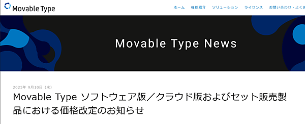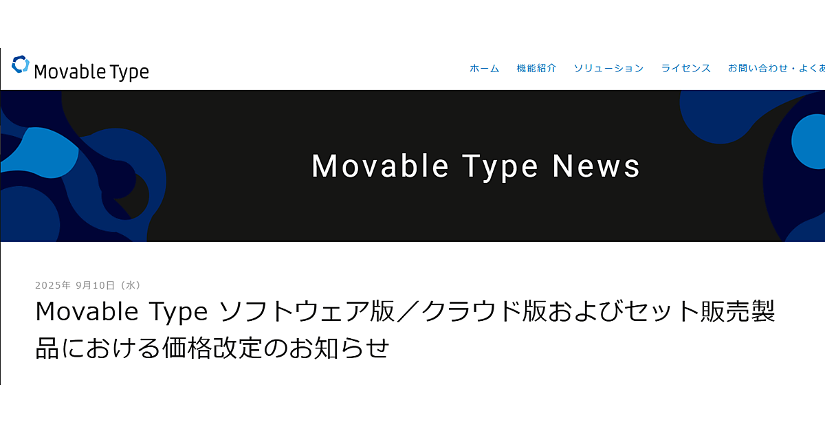 CMS(コンテンツ管理システム)・関連サービス事業のシックス・アパートは、同社のCMSプラットフォーム「Movable Type」のソフト版、クラウド版の価格を2026年4月1日に改定する、と9月10日発表した。ソフト版の年間メンテナンス継続中や、クラウド版を契約中の場合、新料金の適用は2026年4月1日以降の更新・請求分からとなる。