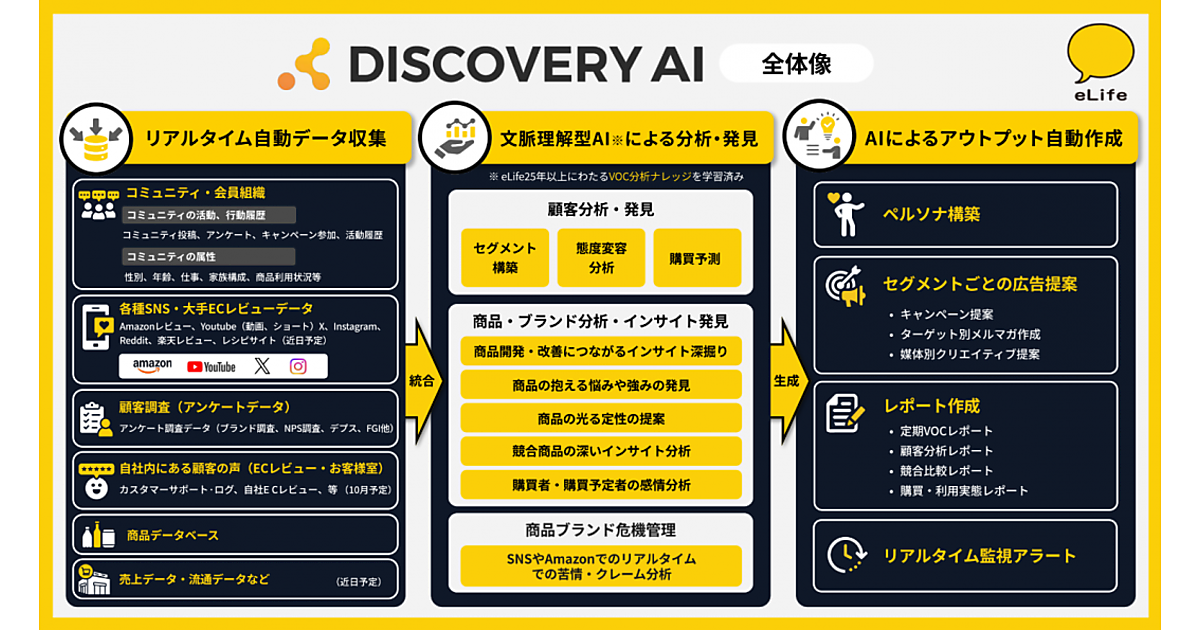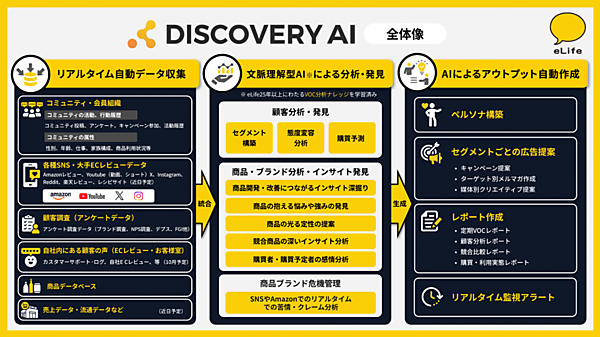 顧客理解や商品ブランドの顧客インサイト発見し、危機管理も可能にするマーケティングAIツール。企業が保有する会員組織や自社アンケートのデータに加え、「X」「YouTube」「Amazon」など大量の外部データをリアルタイムに取得。収集データをAIとアルゴリズムで分析する。AIはイーライフが蓄積した消費者インサイトや抽出ノウハウを学習している。